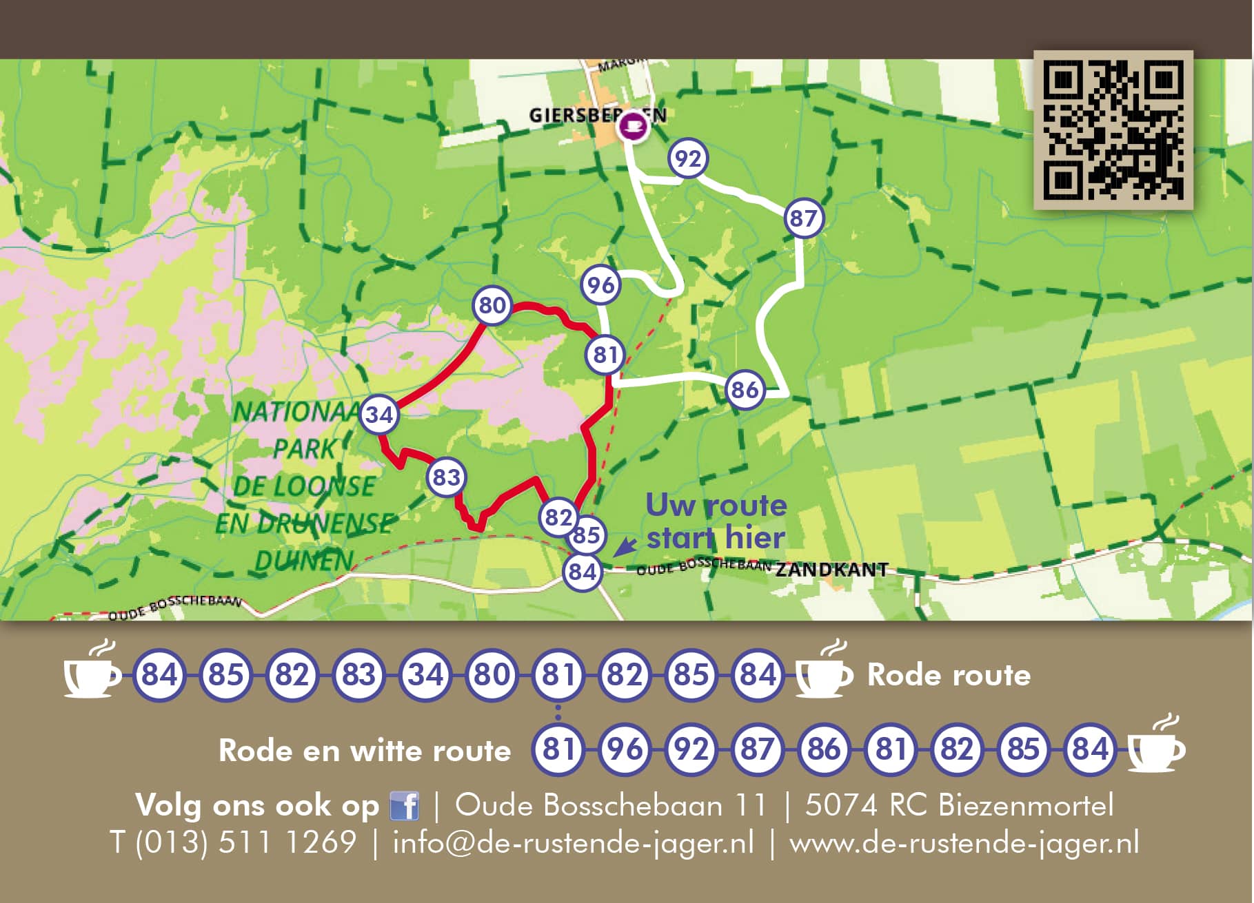 De Loonse en Drunense Duinen behoort tot een van de vier nationale parken die deze provincie rijk is. Het gebied wordt ook wel eens de Brabantse Sahara genoemd. Nergens in Europa zijn er op zo’n grote schaal levende stuifzanden te vinden. Tijdens deze wandelroutes maakt u kennis met het afwisselende gebied. De bosrijke omgeving welke verrassend afgewisseld wordt met de uitgestrekte zandvlaktes. Ga struinen in de duinen en neem de tijd om uit te rusten in de luwte van een duinpan. Geniet van het uitzicht en de stilte. De route is aangegeven met smalle rode pijltjes. Na ongeveer driekwart van de route kunt u overstappen op de witte route, aangegeven met witte pijltjes. Als u deze ronde heeft gelopen, komt u weer op hetzelfde punt terecht om het laatste stuk van de rode route te volgen. De rode route start en eindigt bij De Rustende Jager.